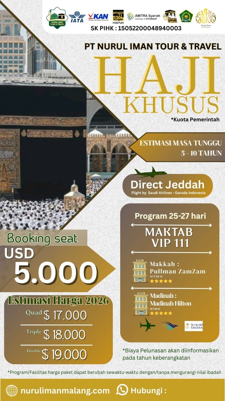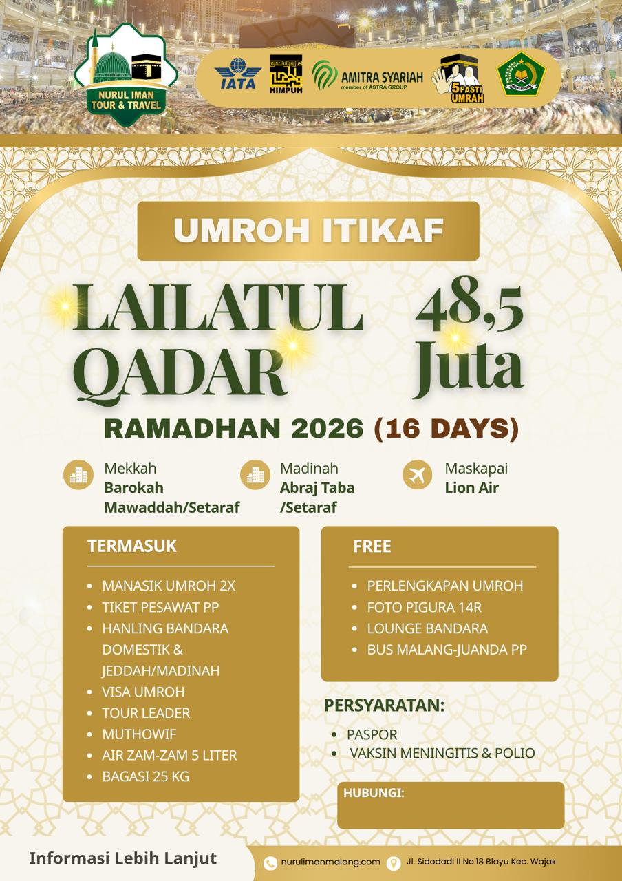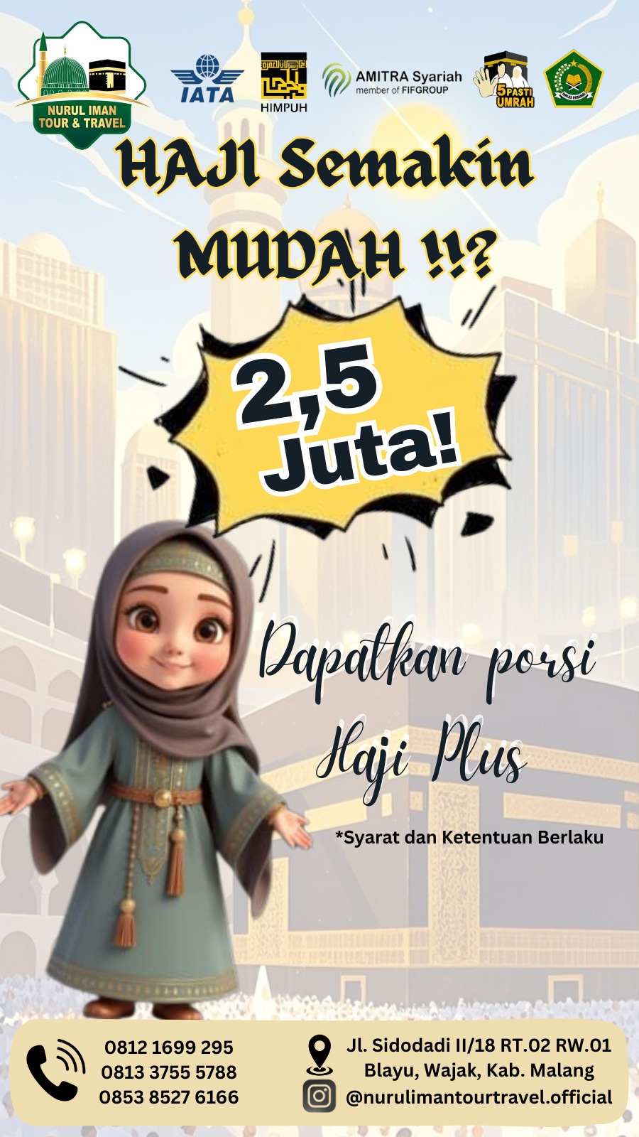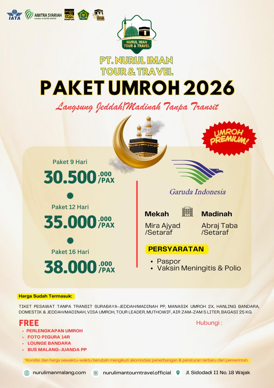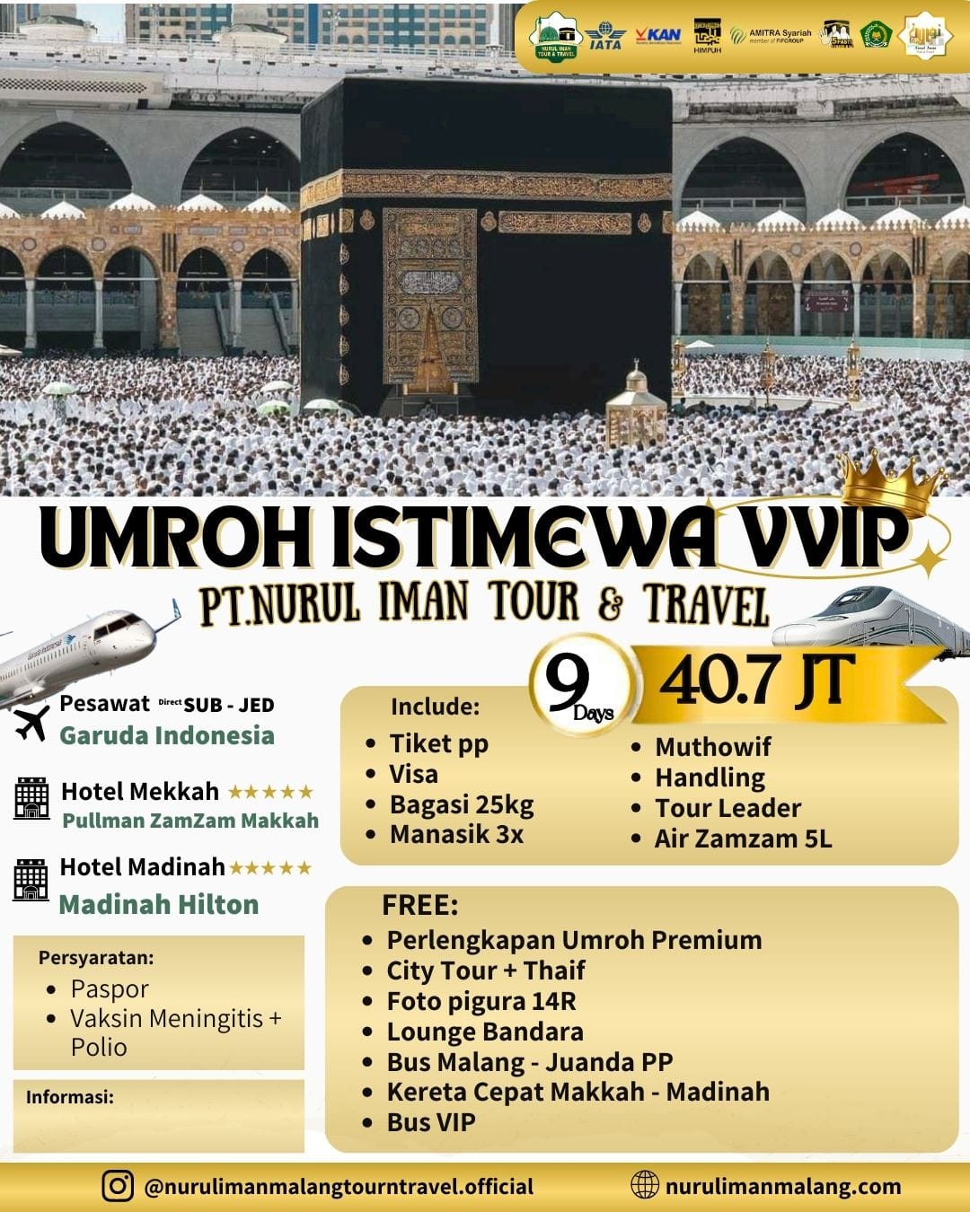 PT. Nurul Iman Tour & Travel adalah salah satu penyedia jasa perjalanan wisata religi di Malang, Jawa Timur yang telah beroperasi sejak tahun 2015. Kami mengkhususkan diri dalam pelayanan Umrah, Haji Plus, dan Haji Langsung Berangkat ( Furodha ) dengan komitmen untuk memberikan pengalaman spiritual yang mendalam bagi setiap jamaah. Berbekal izin resmi dari Kementerian Agama dan didukung oleh tim profesional yang berkompeten, kami menjamin proses ibadah yang lancar, aman, dan nyaman. Pelayanan kami meliputi pengurusan dokumen, manasik, hingga kepulangan, dengan kualitas pelayanan yang terjamin dan harga yang bersaing.